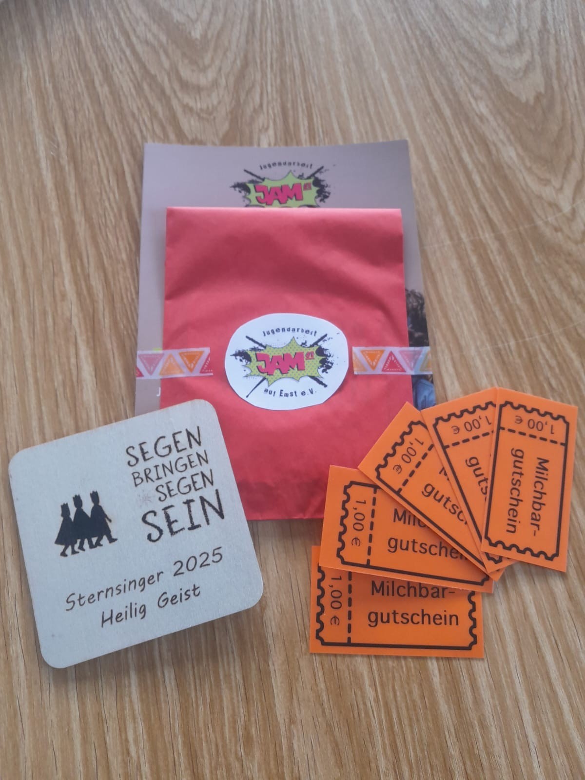Genau an diesem kalten Freitag fand das Nachtreffen der Sternsinger statt – ein Moment, um gemeinsam zurückzublicken und Danke zu sagen. Nach dem gemeinsamen Singen einiger bekannter Lieder gab es eine kleine, aber herzliche Überraschung vom Jamst-Team: Verzehrgutscheine für die Minibar sowie liebevoll gestaltete Holztäfelchen mit Gravur. Ein großes Dankeschön geht hier an Adam, der die Täfelchen mit viel Mühe und Sorgfalt angefertigt hat.